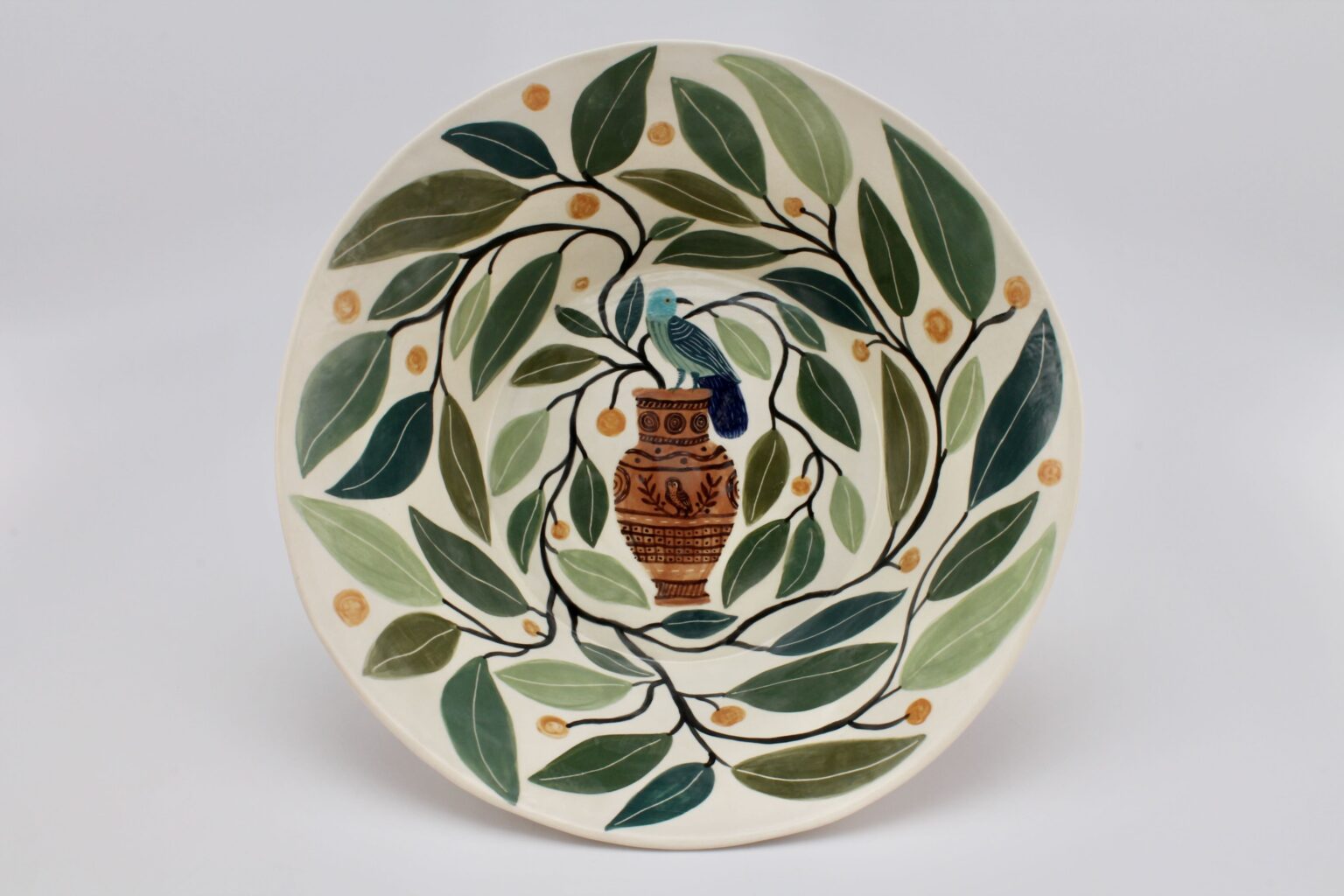 Bird on an ancient vase with oranges and leaves